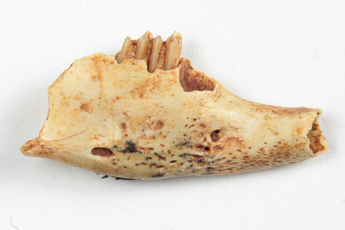 This is a nicely preserved jaw section from an extinct species of pika, Prolagus oeningensis. It came out of the geomorphological karstic site, La Grive-Saint-Alban in France. This site has helped provide an understanding of the diverse European mammalian fauna of the Miocene Epoch.