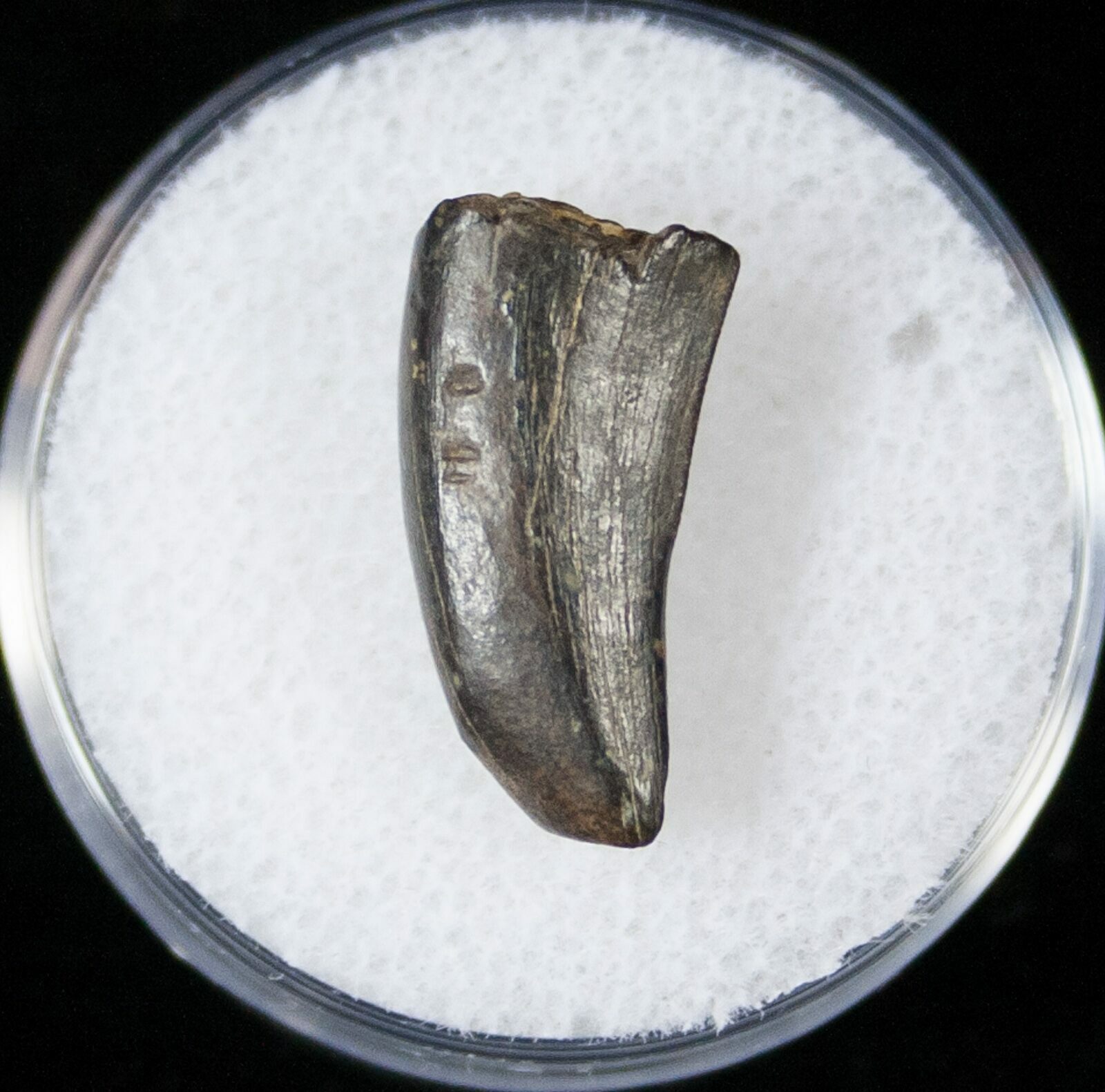 This is a .63" long Tyrannosaur tooth from the Hell Creek Formation of Montana. It has beautiful enamel, some substantial feeding wear to the tip and slight bits of weathering. It comes in an acrylic display case.