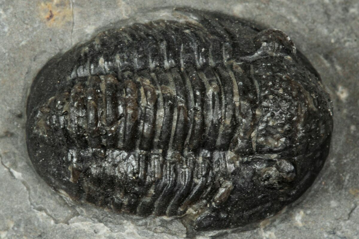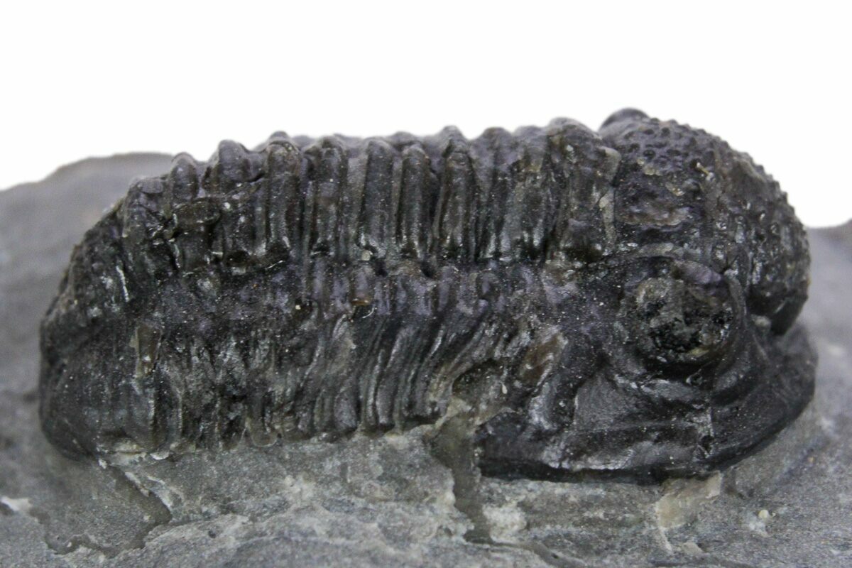 This is a .65" long specimen of the proetid trilobite, Gerastos, collected from Issoumour, Morocco. It is nicely inflated with good shell detail. It has about 2% shell restoration along repaired cracks.