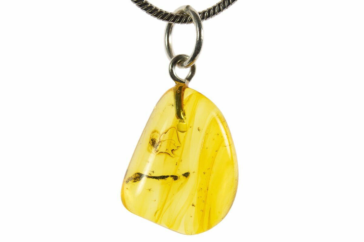 This is a .65" tall (including loop) pendant made from 44 million year old Baltic amber. Within the amber, a small fossil fly (order Diptera) can be seen. A loop has been attached to the amber, along with a secondary ring for the included 24" silver plated snake chain to complete the necklace.