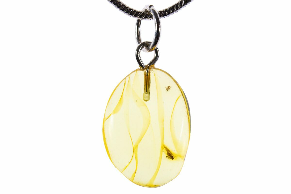 This is a .65" tall (including loop) pendant made from 44 million year old Baltic amber. Within the amber, a small fossil fly (order Diptera) can be seen. A loop has been attached to the amber, along with a secondary ring for the included 24" silver plated snake chain to complete the necklace.