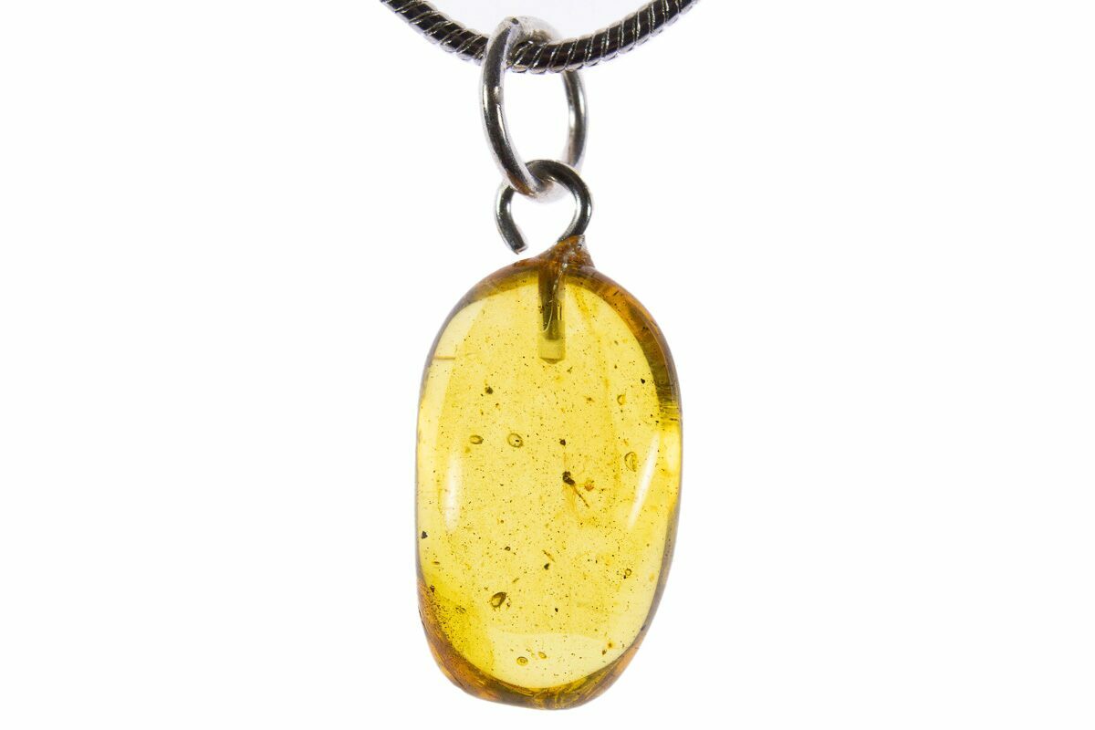 This is a .65" tall (including loop) pendant made from 44 million year old Baltic amber. Within the amber, a small fossil fly (order Diptera) can be seen. A loop has been attached to the amber, along with a secondary ring for the included 24" silver plated snake chain to complete the necklace.