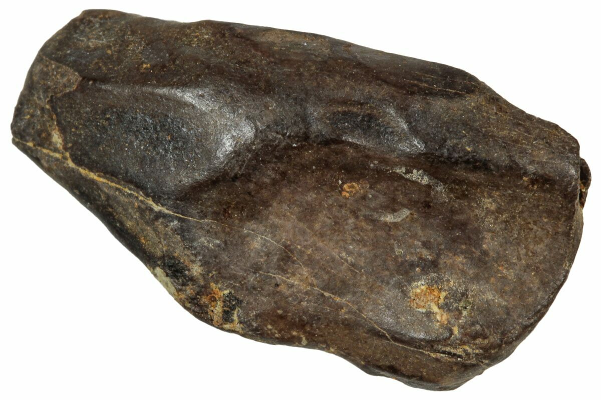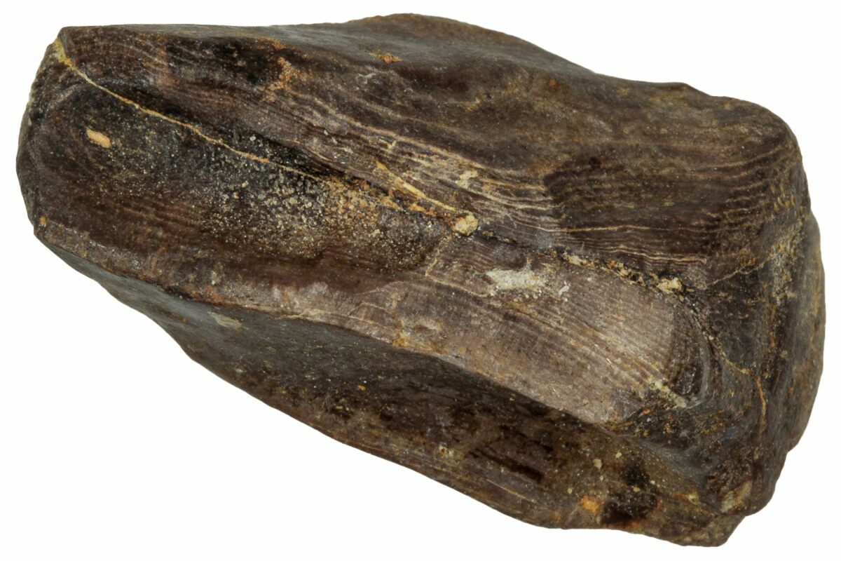 This specimen is one of those naturally shed teeth and features a polished chewing surface, showing clear evidence of the wear that came from processing vegetation millions of years ago.