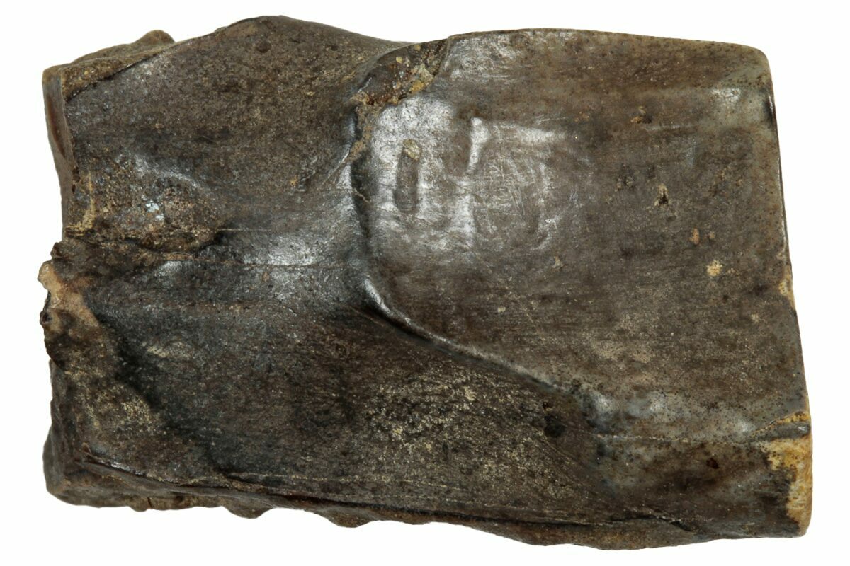 This specimen is one of those naturally shed teeth and features a polished chewing surface, showing clear evidence of the wear that came from processing vegetation millions of years ago.