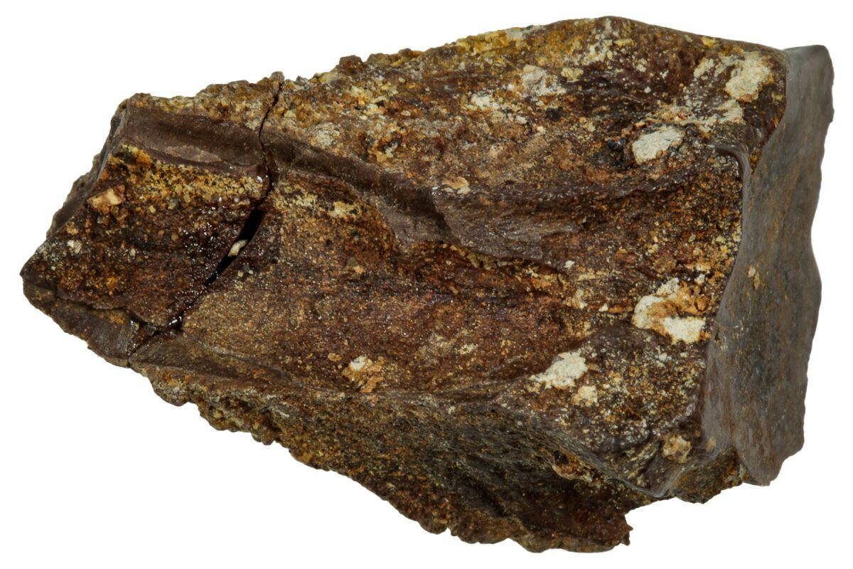 This specimen is one of those naturally shed teeth and features a polished chewing surface, showing clear evidence of the wear that came from processing vegetation millions of years ago.