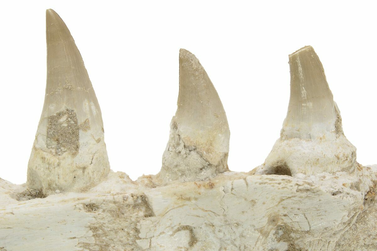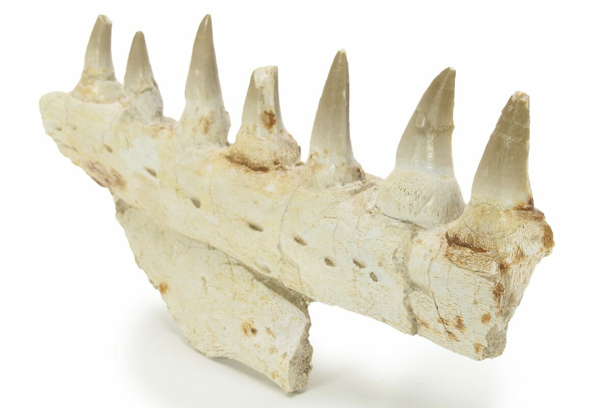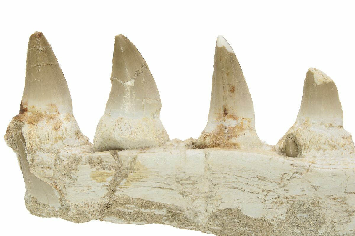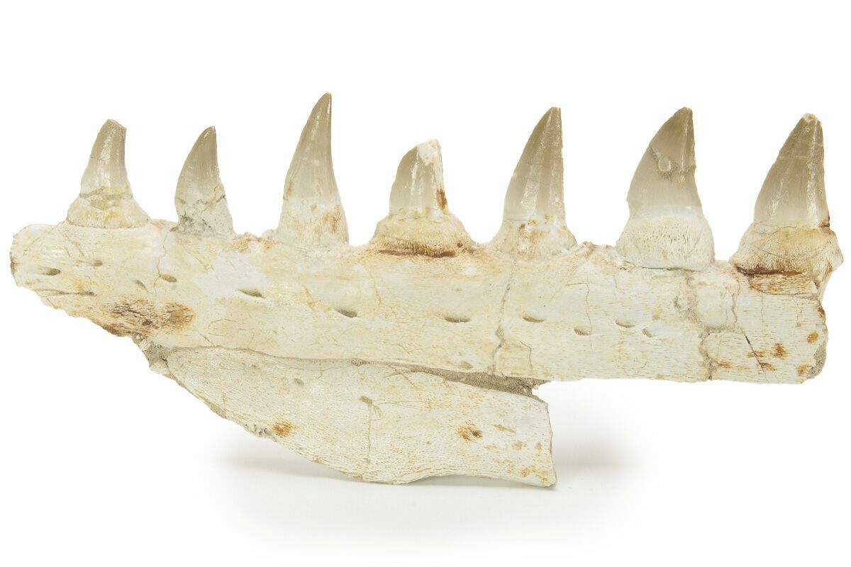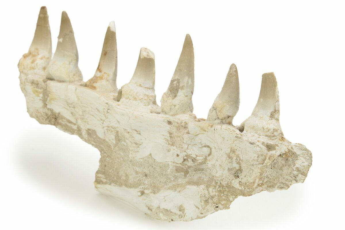 This is an 7.1" fossil jaw section of a mosasaur from the Phosphate Deposits near, Khouribga, Morocco. It is a portion of the mandible (lower jaw) from the left side of the skull. The specimen shows off the foramen, and contains seven fully visible teeth and a few unerupted teeth. Whether or not these teeth belong to this jaw is up for some debate and we suspect some may have been imbedded for a more aesthetic piece. There are almost a dozen Mosasaurs described from these deposits, but based on the teeth it appears to be from the species, Eremiasaurus heterodontus.