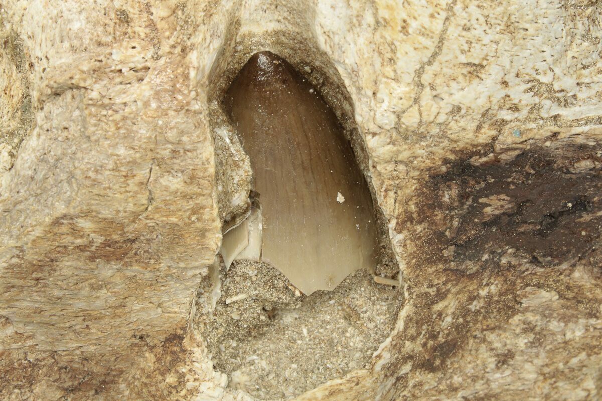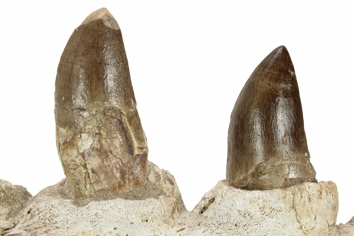 This is a gorgeous, 7.1" long Mosasaur (Prognathodon sp.) jaw section with two large teeth from the Upper Cretaceous phosphate deposits in the Oulad Abdoun Basin of Morocco. There is also an unerupted tooth still within this jaw section though we suspect some of these may have been imbedded for aesthetic appeal. A portion of the jaw is eroded away and reveals the root of the tooth still within the socket.