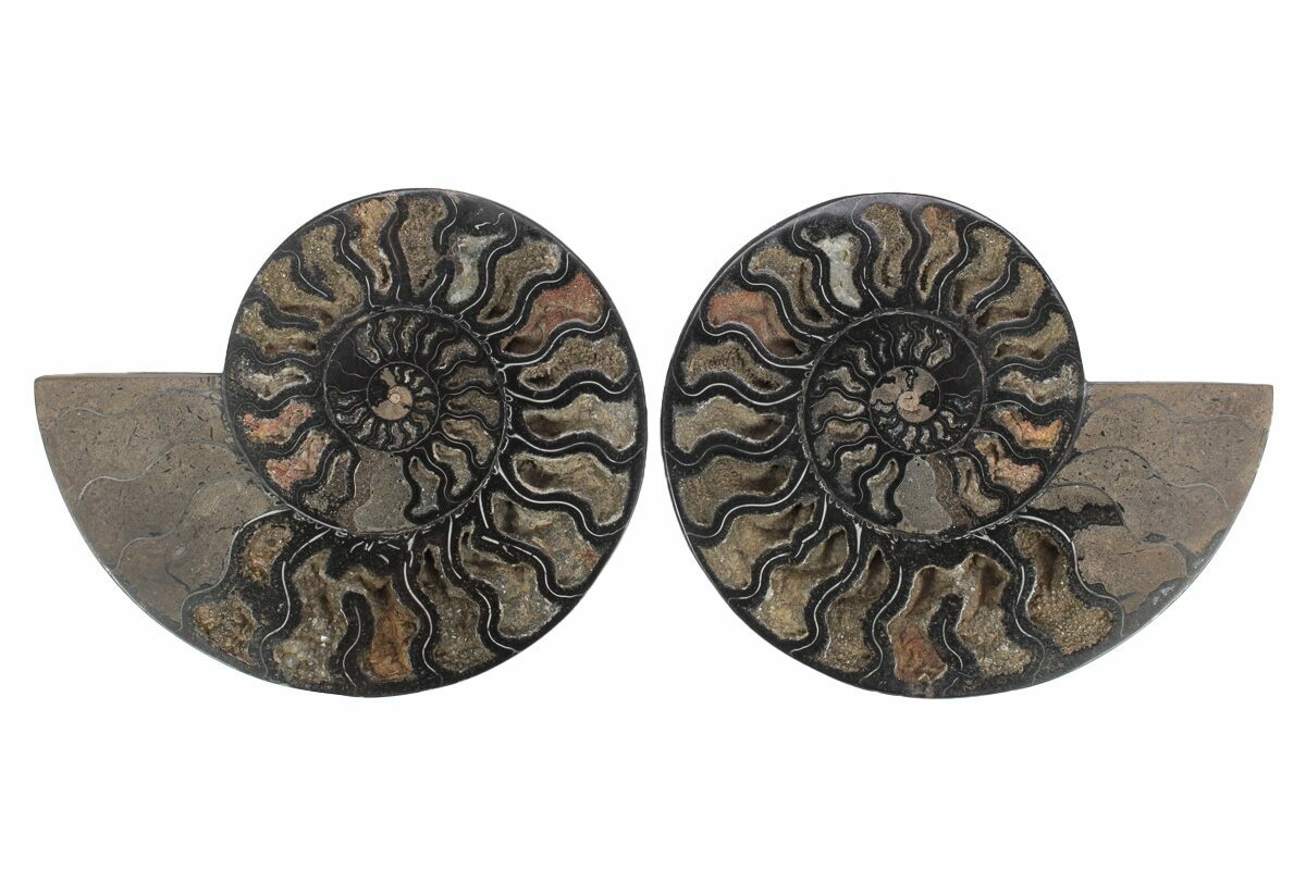 Most agate-replaced ammonites from Madagascar display warm tones of brown, red, orange, or yellow, which is why this striking orange-and-black coloration stands out as quite uncommon. These specimens come from a different locality where post-fossilization geochemistry altered the original mineralization. The bold hues—particularly the deep blacks—are likely the result of elevated manganese introduced during the fossil’s diagenetic history. We typically are only able to get a limited quantity of these black specimens every couple of years.