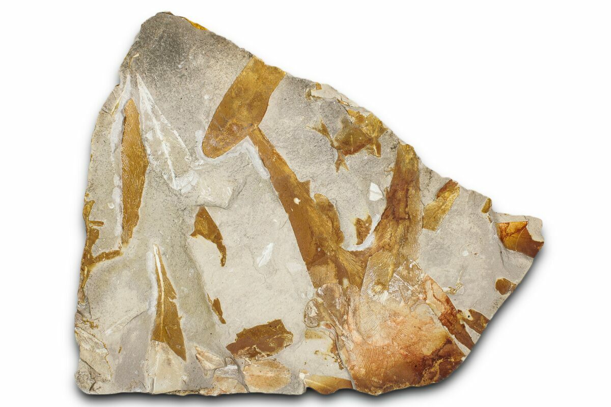 This is a 7.2" wide plate of fossil seed fern leaves of the species Glossopteris browniana. This specimen was collected from the Upper Permian aged Illawarra Coal Measures of New South Wales, Australia. The largest leaf measures 4.6" long.