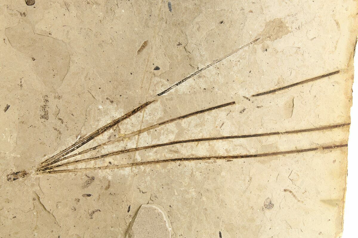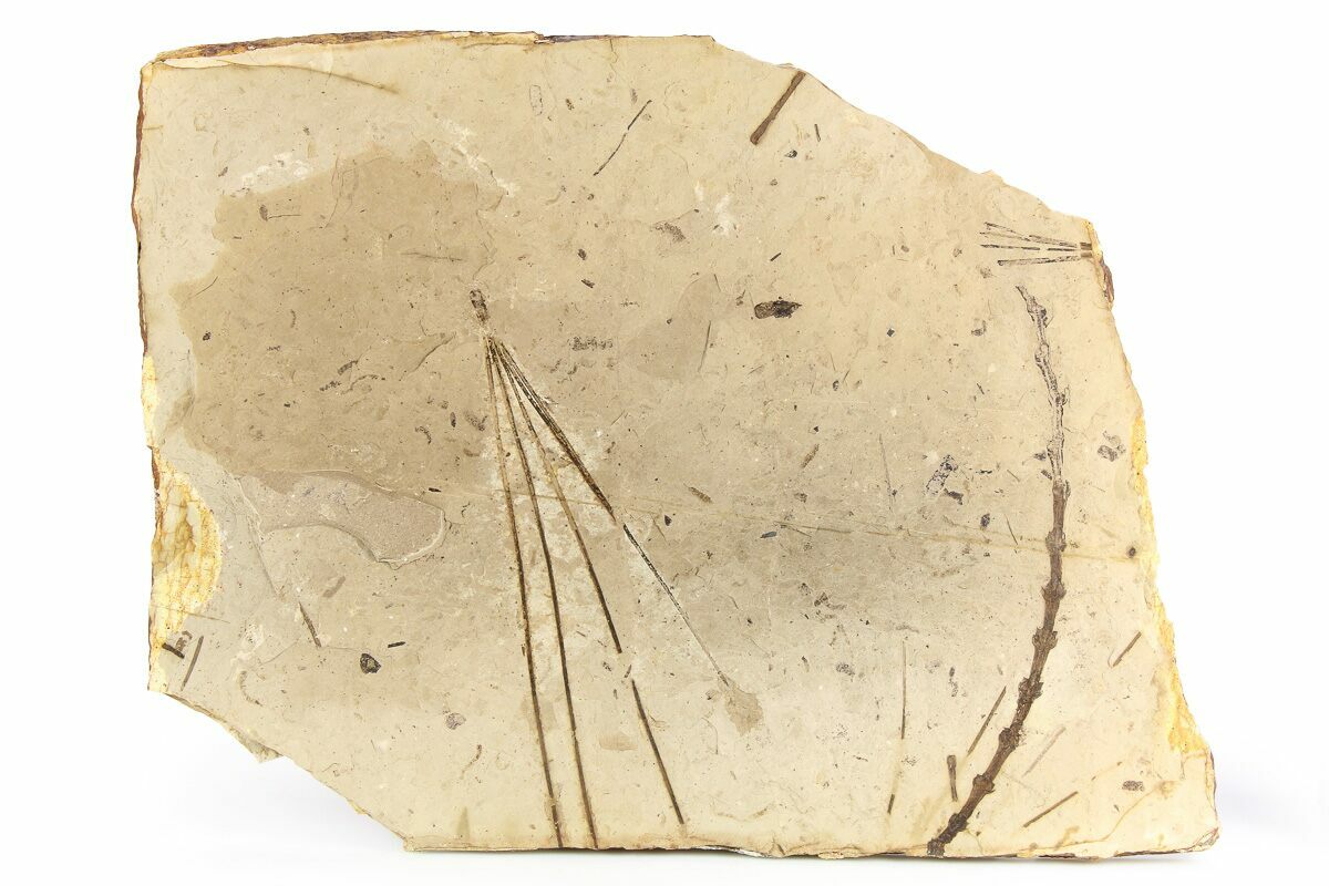 This is a fossil leaf plate from the McAbee fossil beds of British Columbia, Canada. It contains several needle cluster impression from a Pinus species, the largest of which measures 5.45". A large conifer stem (Thuja?) is also on the plate.