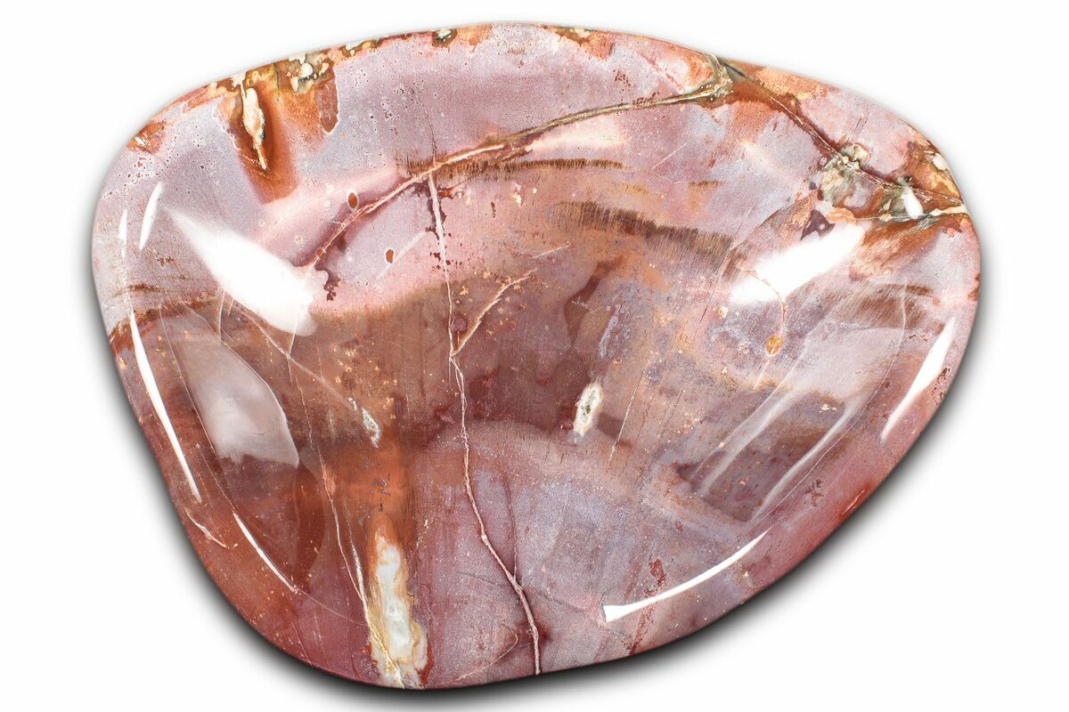 Madagascar petrified wood comes primarily from extensive Triassic-aged deposits in the Mahajanga Basin of northwestern Madagascar, where ancient conifer forests—often attributed to species related to Araucarioxylon—were buried by volcanic ash and floodplain sediments roughly 225–240 million years ago. Over immense spans of time, silica-rich fluids percolated through these sediments, replacing the cellular structure of the wood with chalcedony, jasper, agate, and quartz while preserving growth rings, bark textures, and even microscopic details. The region’s unique geochemistry—especially its iron, manganese, and occasionally copper content—produces the vivid palette Madagascar petrified wood is famous for, including deep brick reds, golden yellows, smoky blacks, and pastel pinks. Many logs are found fully silicified and naturally fractured into large, rounded segments that local artisans cut into slabs, spheres, eggs, and freeforms. These deposits stretch across arid badlands where erosion steadily exposes new material, making Madagascar one of the world’s premier sources of highly colorful, beautifully patterned fossil wood.