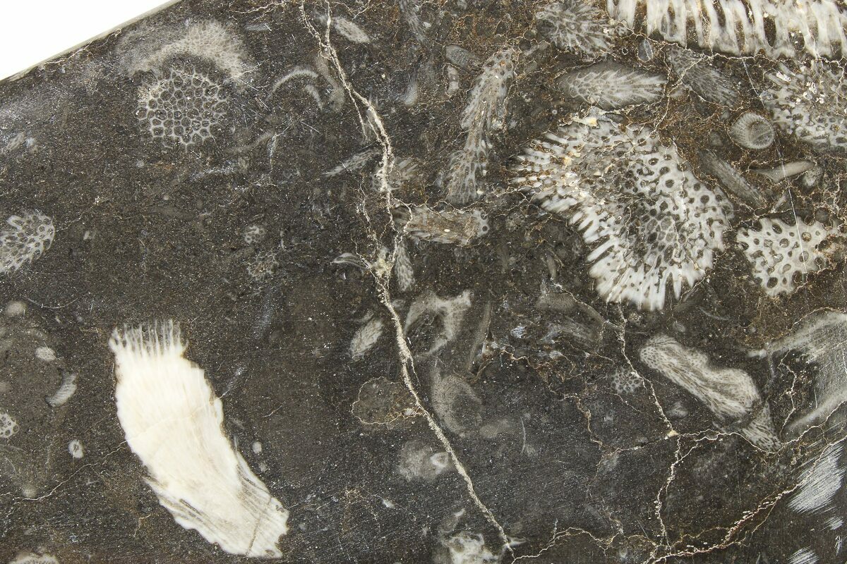 This is a 7.3" wide plate of coral and bryozoan cross sections, collected from Issoumour, Morocco. The fossils come from a Devonian-aged marine deposit and their white preservation contrasts nicely against the black rock. The specimen has been nicely polished across one face and along the periphery to reveal these interesting fossils, which are visible along both sides of the plate.