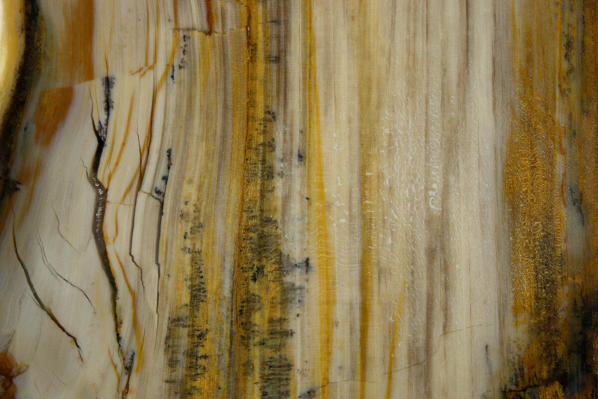 The front of the petrified wood has been cut flat along the grain (rip-cut), with the display face being polished to a glossy finish.