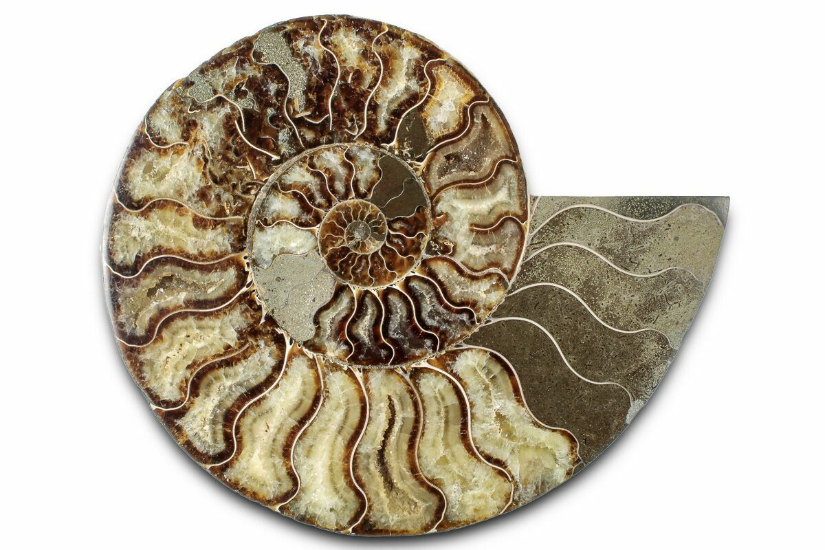 Here is a 7.4" wide, cut and polished ammonite (Cleoniceras) fossil from Madagascar. These ammonites are Cretaceous in age, approximately 110 million years old. This specimen exhibits gorgeous mineralization within the chambers, each separated by white calcite septa (divisions). This highly polished, exotic ammonite makes a superb display piece with tremendous historical appeal.