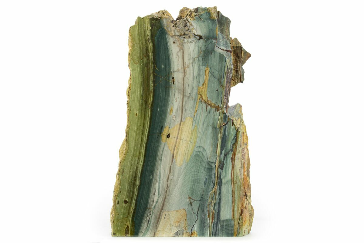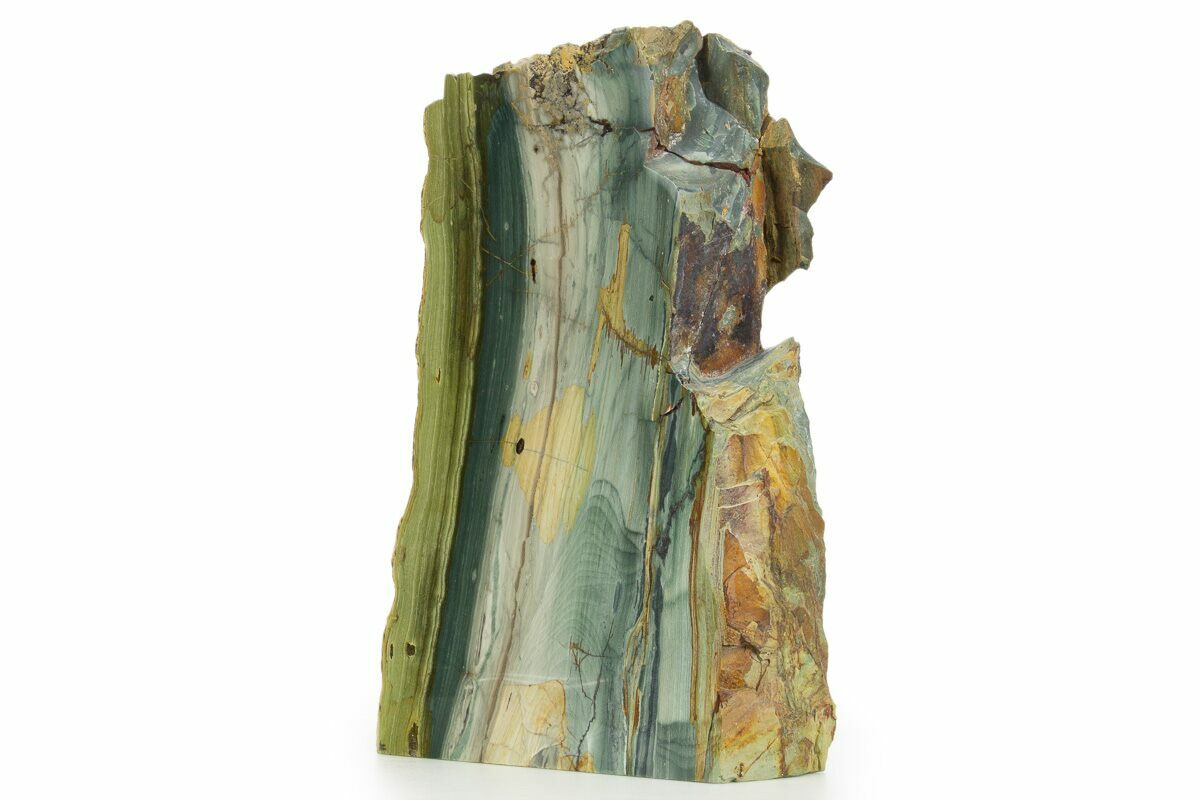 This is a 7.4" tall section of jasper replaced petrified wood that was collected near McDermitt, Oregon. This section has been polished to a glossy finish on one side and the base has been cut flat for aesthetic presentation. It has absolutely stunning blue and green coloration.