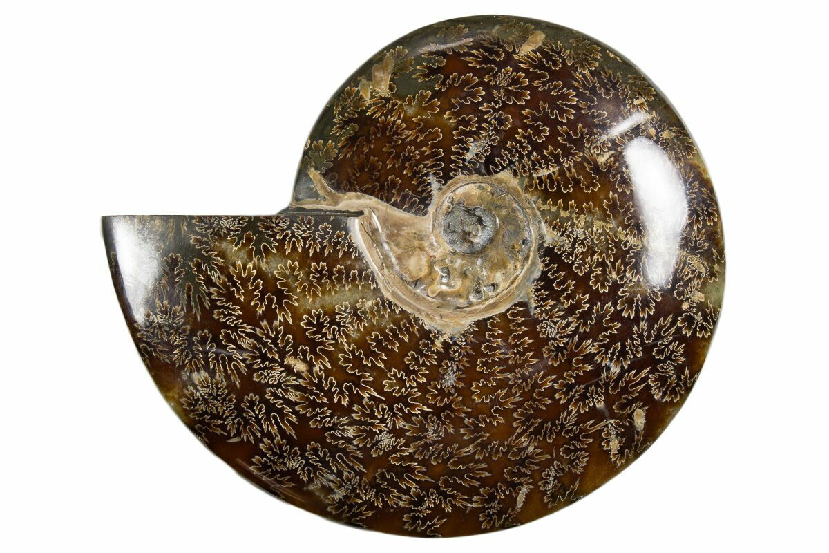 This is a 7.5" wide polished ammonite of the genus Cleoniceras, collected in Madagascar. It is absolutely gorgeous, displaying a distinctive "oak-leaf" suture pattern on the surface. This 110 million year old ammonite is truly a natural work of art, displaying beautifully on the included acrylic stand.