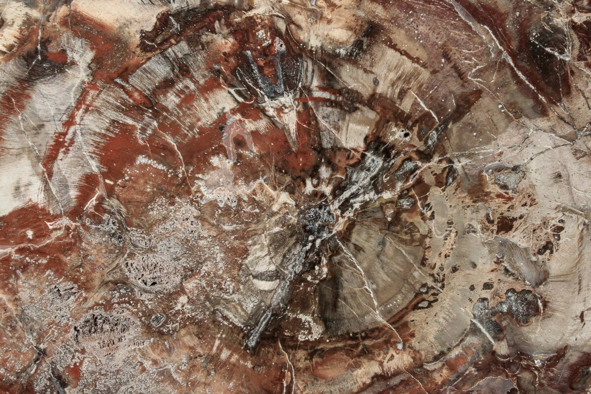 Madagascar petrified wood comes primarily from extensive Triassic-aged deposits in the Mahajanga Basin of northwestern Madagascar, where ancient conifer forests—often attributed to species related to Araucarioxylon—were buried by volcanic ash and floodplain sediments roughly 225–240 million years ago. Over immense spans of time, silica-rich fluids percolated through these sediments, replacing the cellular structure of the wood with chalcedony, jasper, agate, and quartz while preserving growth rings, bark textures, and even microscopic details. The region’s unique geochemistry—especially its iron, manganese, and occasionally copper content—produces the vivid palette Madagascar petrified wood is famous for, including deep brick reds, golden yellows, smoky blacks, and pastel pinks. Many logs are found fully silicified and naturally fractured into large, rounded segments that local artisans cut into slabs, spheres, eggs, and freeforms. These deposits stretch across arid badlands where erosion steadily exposes new material, making Madagascar one of the world’s premier sources of highly colorful, beautifully patterned fossil wood.