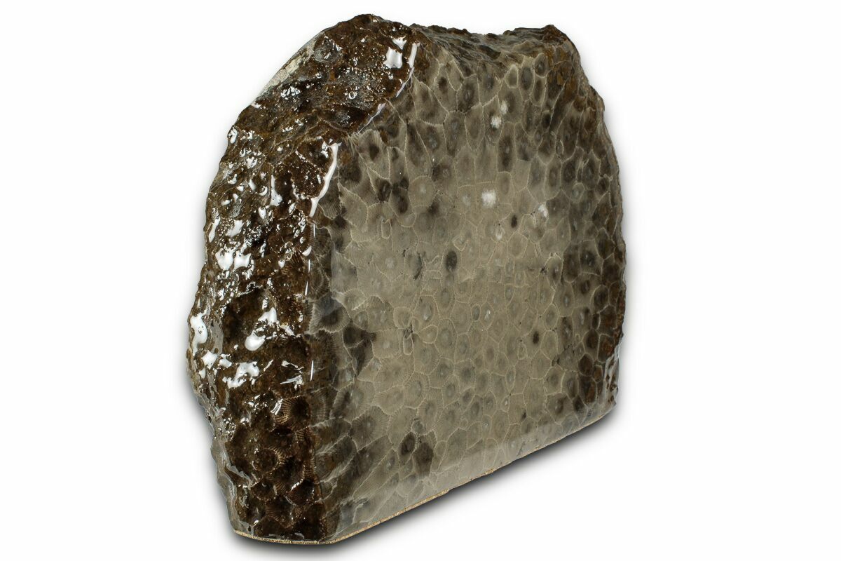 Known locally as Petoskey stones, this fossil coral is commonly found along the shores of Lake Michigan and Lake Huron, as well as in rock quarries stretching from Alpena to Traverse City, Michigan. The material comes from Hexagonaria percarinata, a species of rugose coral that lived during the Middle Devonian, roughly 350 million years ago. Petoskey stones are officially designated as the state stone of Michigan.