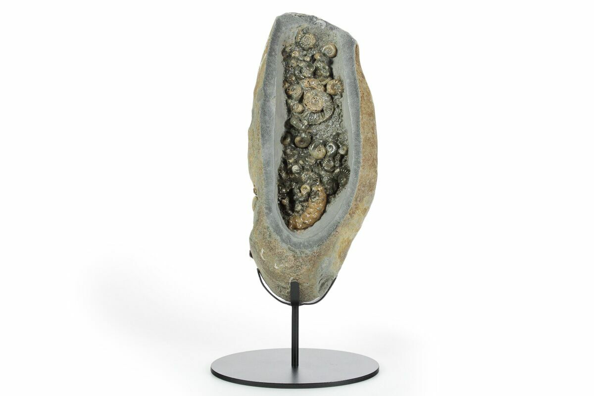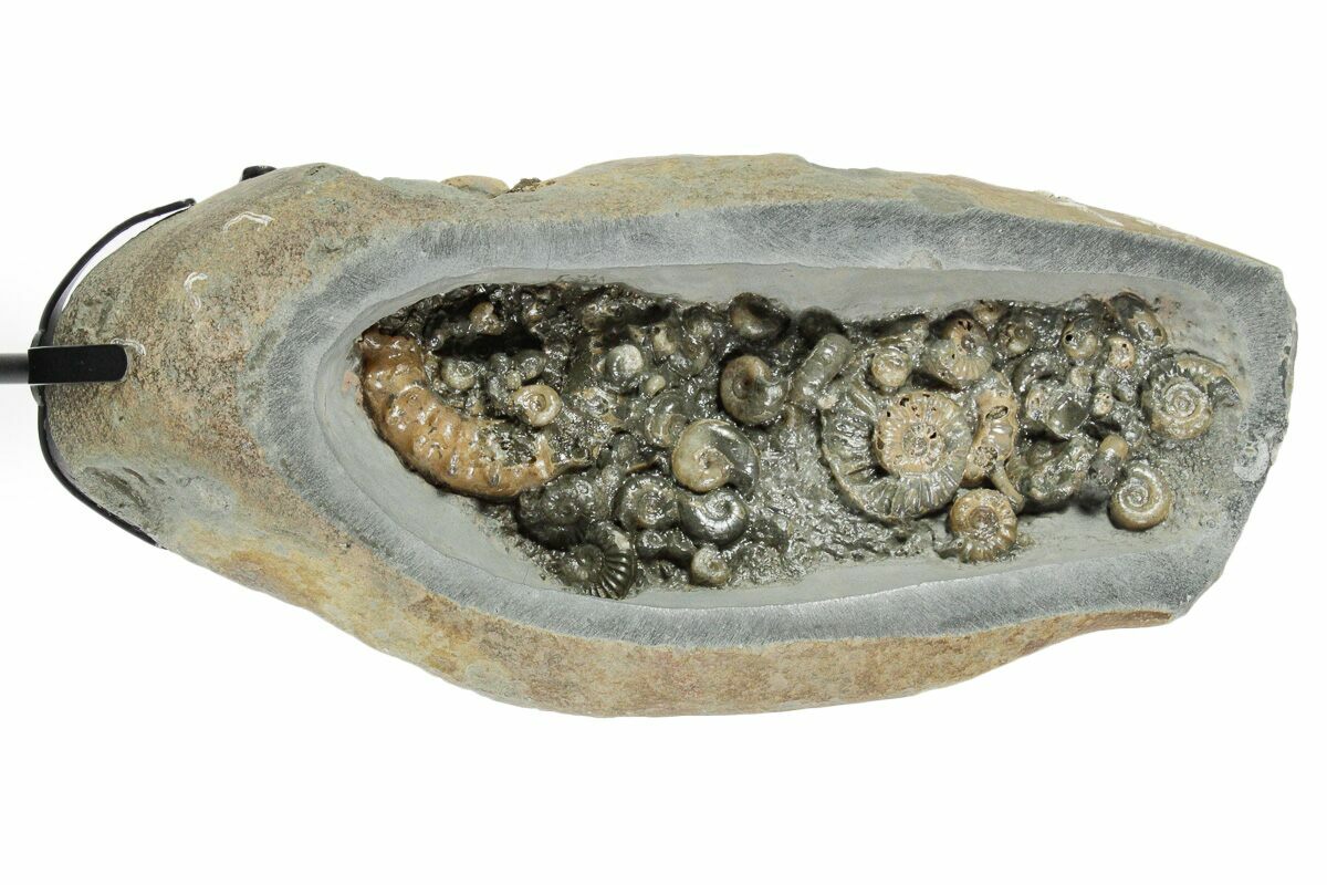 This is a 7.6" wide concretion filled with small, golden calcite replaced fossil ammonites of the genus/species Xipheroceras drudreiseri, Promicroceras praecompressum, and Cymbites. It was collected from Monmouth Beach near the town of Charmouth, England. This type of ammonite specimen is commonly referred to as "popcorn stone". The concretion was painstakingly prepared using mechanical tools to expose the ammonite fossils and bring them out in high relief.