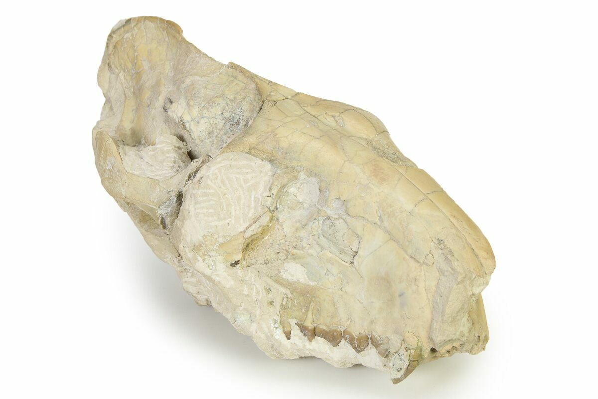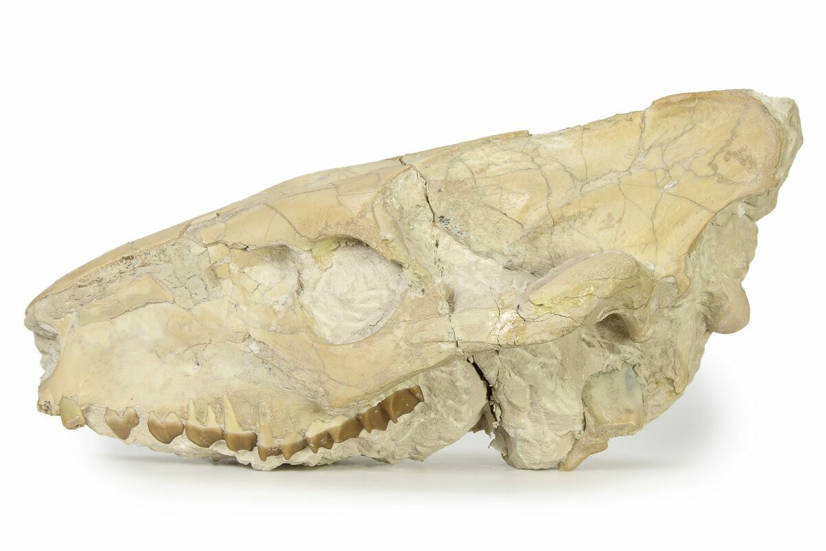 This is a 7.6" long, partial upper skull of an oreodont (Merycoidodon culbertsoni). It was collected from the White River Formation in South Dakota and would be approximately 30-35 million years old. All of the teeth are natural and most appear to be complete.