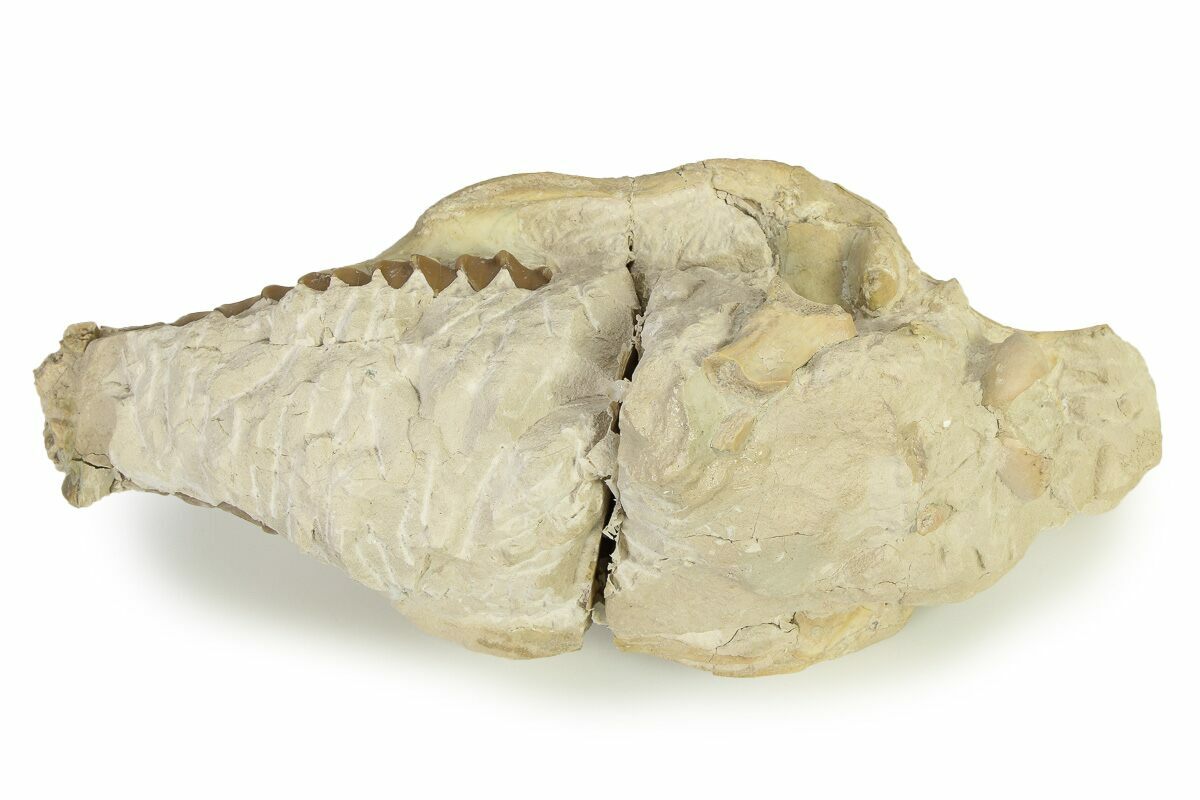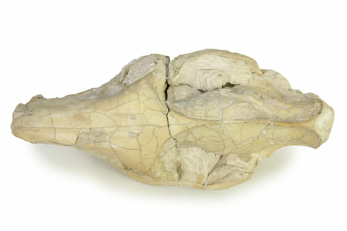 There is a repaired crack running through the middle of the skull. This specimen could make for a fun preparation project as there is a significant amount of rock still attached. Comes with a display stand to assist with presentation.