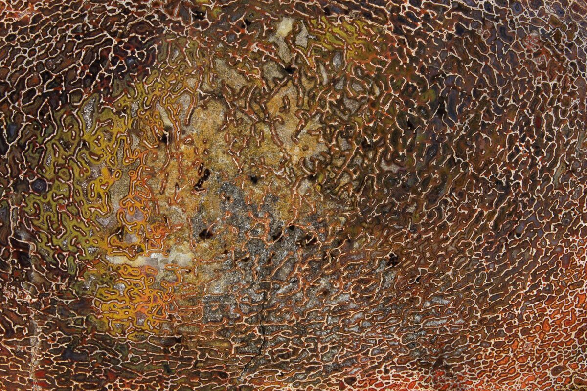 Dinosaur gembone (agatized dinosaur bone) forms when the porous structure of dinosaur bone is replaced by silica-rich minerals like agate, chalcedony, or jasper. This preserves the bone’s internal cell patterns, creating striking, web-like textures visible when polished.