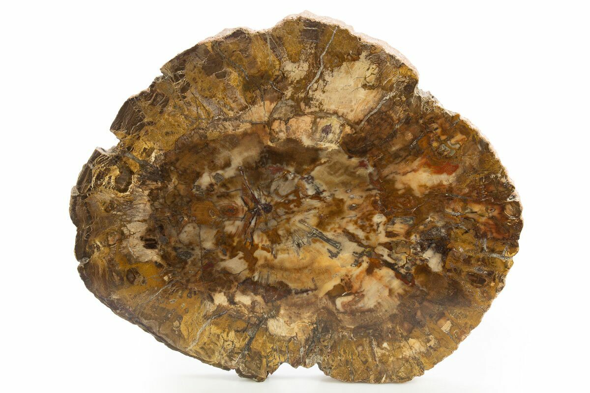 This is a 7.7" wide round of petrified wood (Araucaria) from Ambilobe, Madagascar. Araucaria is a coniferous tree in the family that includes the modern Monkey Puzzle tree. This 220 million year old petrified wood has been sliced and polished on both sides, allowing the stunning inner wood detail and fantastic coloration to easily be seen.