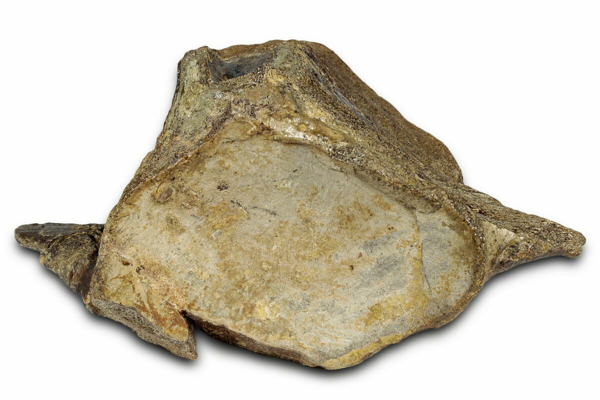 This is a 7.7" wide mosasaur (Tylosaurus proriger) vertebra collected from Fannin County, Texas. It comes out of the Cretaceous-aged Ozan Marl Formation in Texas. The preservation is nice with the majority of the vertebra showing little weathering. The base of the left transverse process has a large repaired crack with gap fill restoration and a portion of the posterior end of the centrum is missing.