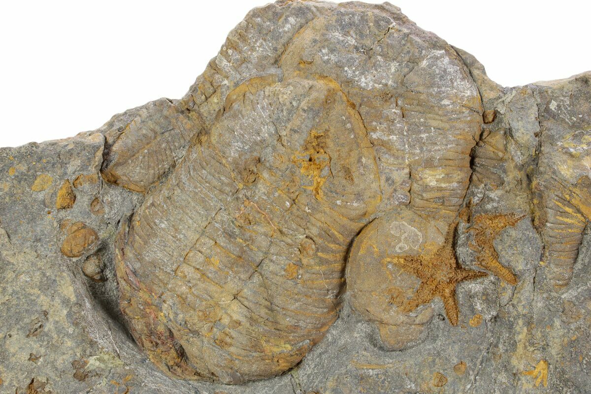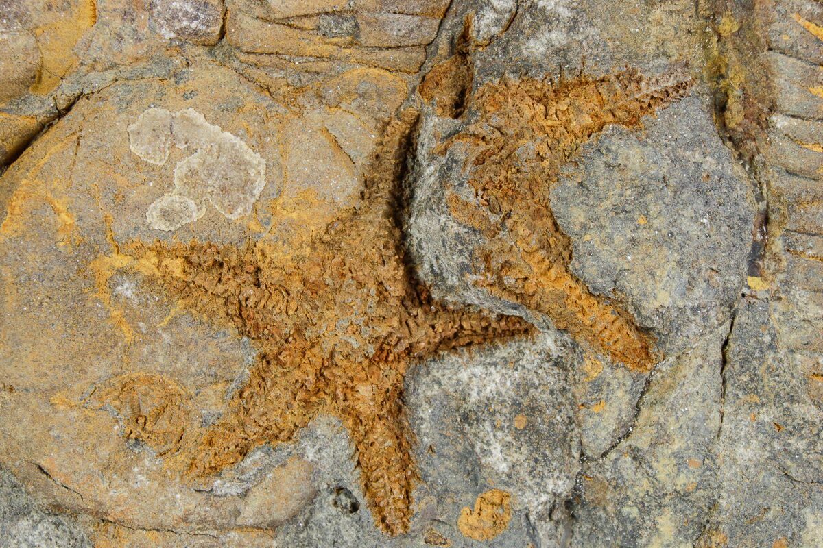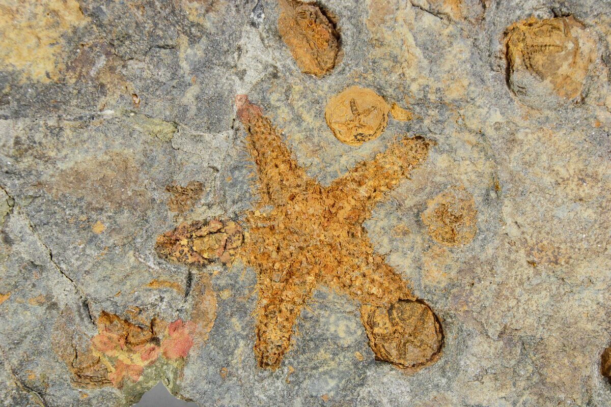 This is a 15 x 9" slab of limestone covered in Ordovician aged fossils from the Tiouririne Formation of Morocco. There three fossil starfish, two Dalmanitid trilobites and about two dozen Edrioasterois.