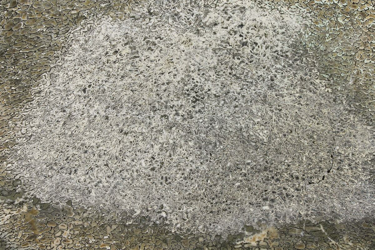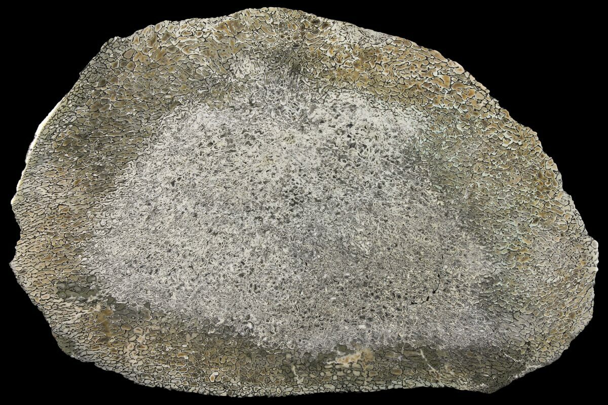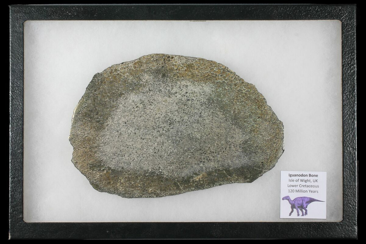 This 7.7" wide is a slab of polished, Iguanodon bone showing stunning internal cell structure. It has been partially replaced with iron pyrite. It was collected from the Lower Cretaceous, Wealden Clay Formation on the Isle of Wight. While complete or near complete bones are rare, water tumbled chunks are often found after they erode out of the cliffs on the isle.