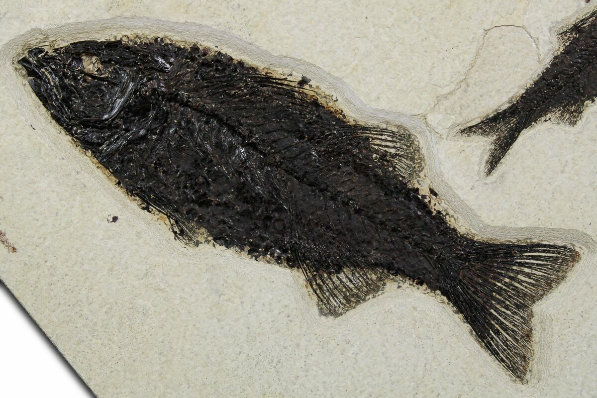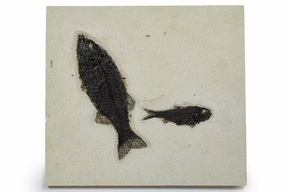 This is a 7.8" wide fossil fish plate collected from the gastropod layer at Clear Creek Quarry just outside Kemmerer, Wyoming. The rock contains two fish (Mioplosus labracoides and Knightia eocaena) fossils that are naturally associated with each other and bear jet-black preservation. The Mioplosus is 8.6" long and the Knightia is 4.6" long.