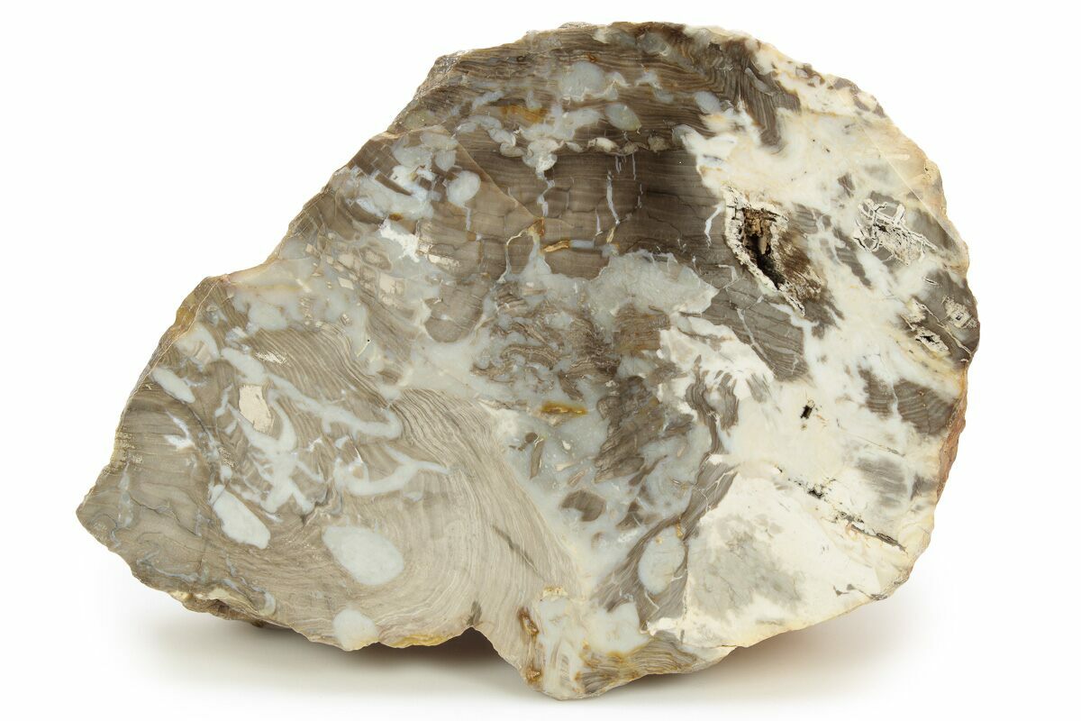 This is a 7.8" polished section of petrified wood (Conifer) from Australia, known as "Peanut Wood". It is actually petrified driftwood that is full of boreholes from clam larvae of the genus Teredo, commonly know as shipworms. These boreholes were filled in by a white mineral during the fossilization process, giving this petrified wood its unique appearance. The wood itself is from Aruacaria, a type of conifer and is Lower Cretaceous in age, or approximately 113 million years old.