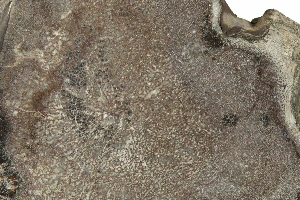 This is a 7.8" wide section of dinosaur bone from the Morrison Formation of either Utah or Colorado. One side has been cut flat and polished to a glossy finish which allows for the beautiful internal cell structure to be seen.