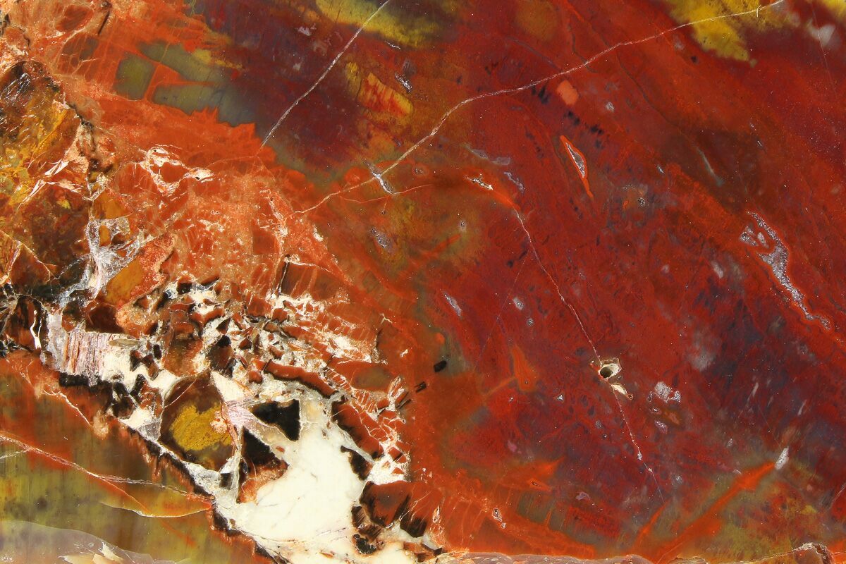The petrified wood from Araucarioxylon arizonicum happens to be the state fossil of Arizona. It is frequently referred to as "rainbow wood" because of the large variety of colors some specimens exhibit. The reds and oranges come from hematite inclusions within the silica, the yellows from limonite, and the purples from extremely fine hematite spherules.