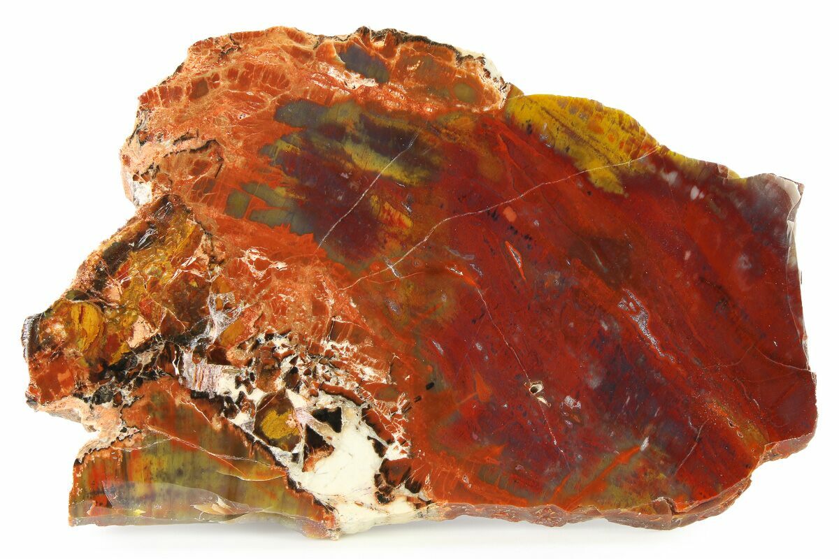 This is a colorful, 7.8" wide slab of petrified wood (Araucarioxylon arizonicum) from Arizona. One side of the specimen has been polished to a glossy finish.