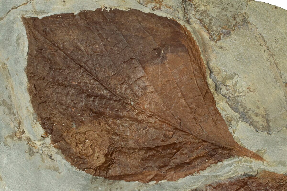 These are two fossil leaves (two species) from the Fort Union Formation near Glendive, Montana. The rock contains one Ficus leaf (#7) and one Beringiaphyllum cupanoides leaf (#30). The orange/brown preservation contrasts well against the shale, and many of the details in the leaves can be seen in good relief. There may be some touchups to the surface of the leaves where pieces of them flaked onto the negative during collection.