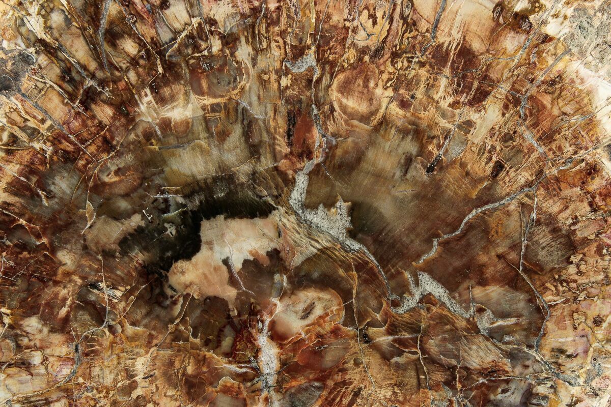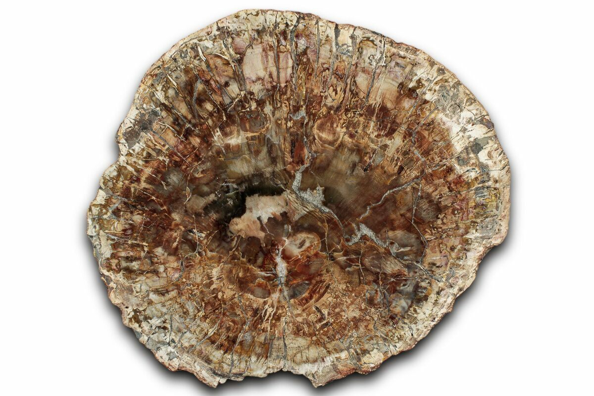 Madagascar petrified wood comes primarily from extensive Triassic-aged deposits in the Mahajanga Basin of northwestern Madagascar, where ancient conifer forests—often attributed to species related to Araucarioxylon—were buried by volcanic ash and floodplain sediments roughly 225–240 million years ago. Over immense spans of time, silica-rich fluids percolated through these sediments, replacing the cellular structure of the wood with chalcedony, jasper, agate, and quartz while preserving growth rings, bark textures, and even microscopic details. The region’s unique geochemistry—especially its iron, manganese, and occasionally copper content—produces the vivid palette Madagascar petrified wood is famous for, including deep brick reds, golden yellows, smoky blacks, and pastel pinks. Many logs are found fully silicified and naturally fractured into large, rounded segments that local artisans cut into slabs, spheres, eggs, and freeforms. These deposits stretch across arid badlands where erosion steadily exposes new material, making Madagascar one of the world’s premier sources of highly colorful, beautifully patterned fossil wood.