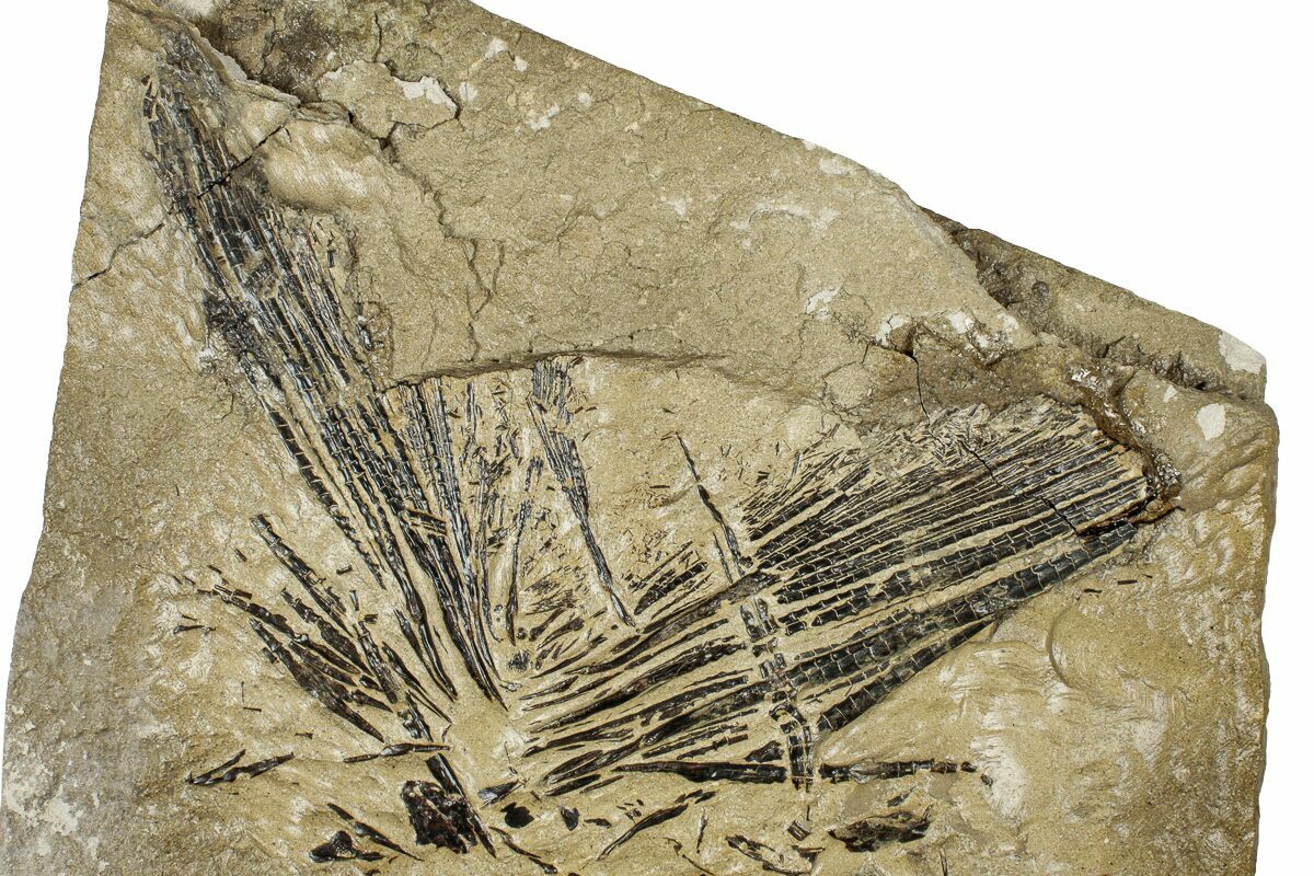 This is a 7.9" wide fossil fish (Cimolichthys nepaholica) caudal fin still in rock, collected from the Niobrara Formation of Gove County, Kansas. Some of the vertebrae can also be found near one edge of the rock.