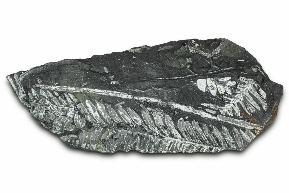 This is a 7.9" wide plate of fossil seed ferns from the Pennsylvanian aged (305 million year) Llewellyn formation of Pennsylvania. The white color of these detailed fern fossils contrasts well against the black shale they are preserved in. There are fossils covering both sides of the piece. These St. Clair fern plates used to be quite common but access to the locality is now restricted so there is not a lot of material left on the market.