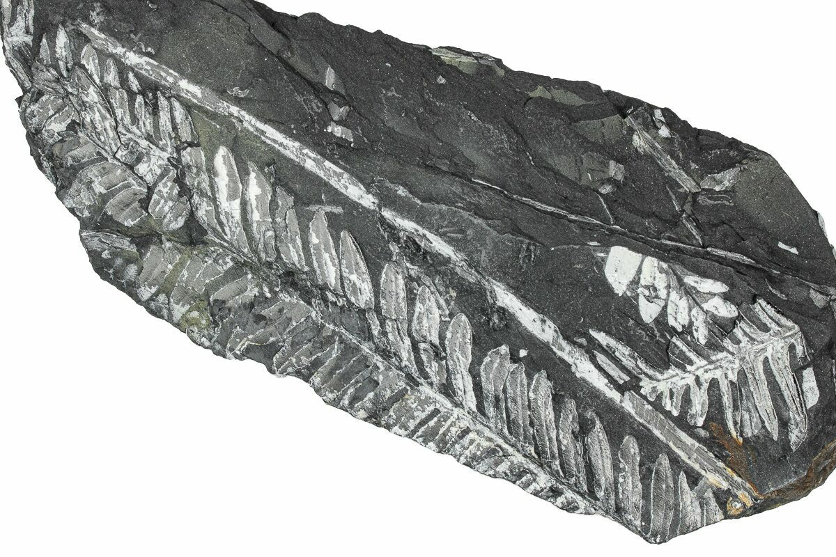 These plants were buried in a swamp where a low temperature, low pressure, and low oxygen environment caused the plant tissue to be slowly replaced by pyrite. This pyrite was later replaced by a whitish mineral (aluminum silicate) as the fossils were buried and exposed to the heat and pressure inside of the earth. The majority of the ferns on this plate are of the genus Alethopteris, though Pecopteris ferns can be seen from time to time.