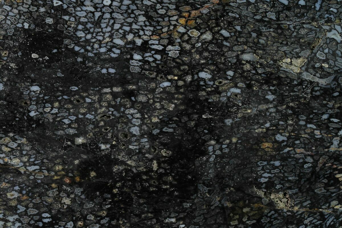 This is a 7.9" wide, polished slab of black petrified palm root from Indonesia. The vascular nature of root means that traditional tree rings are replaced by pores and channels. It has been polished on both sides to show off this internal structure. This slab doesn't maintain a uniform thickness all the way across.