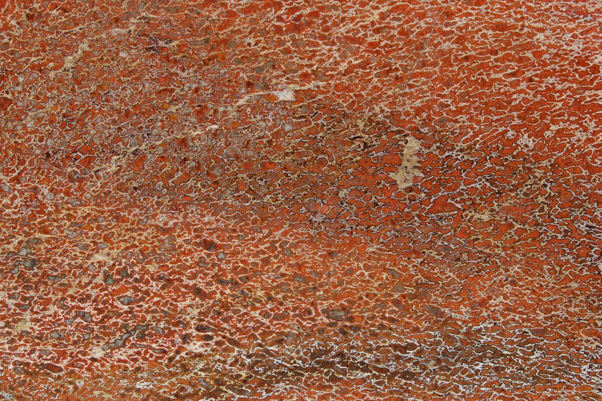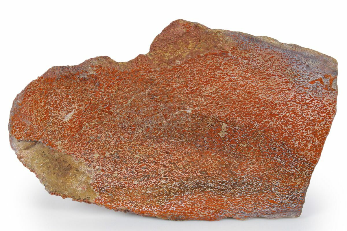 This is a vibrant, 7.9" wide slab of polished agatized dinosaur bone (gembone) from the Morrison Formation in New Mexico. Beautiful bright red colored cells on this specimen. It is cut flat on both sides and polished to a glossy finish on one.