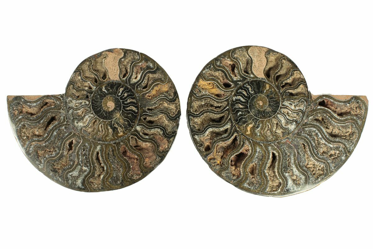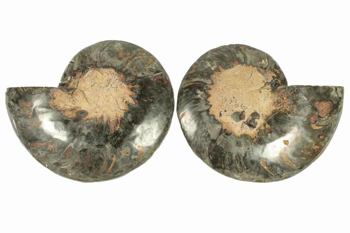 Most agate-replaced ammonites from Madagascar display warm tones of brown, red, orange, or yellow, which is why this striking orange-and-black coloration stands out as quite uncommon. These specimens come from a different locality where post-fossilization geochemistry altered the original mineralization. The bold hues—particularly the deep blacks—are likely the result of elevated manganese introduced during the fossil’s diagenetic history. We typically are only able to get a limited quantity of these black specimens every couple of years.