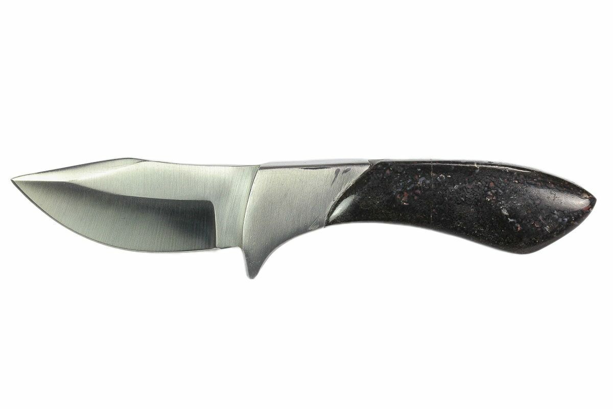 This is a 7", full tang knife inlaid with polished, 150 million year old, agatized fossil dinosaur bone. The internal cell structure of the dinosaur bone can clearly be seen. The gembone is a dark, bluish black coloration.