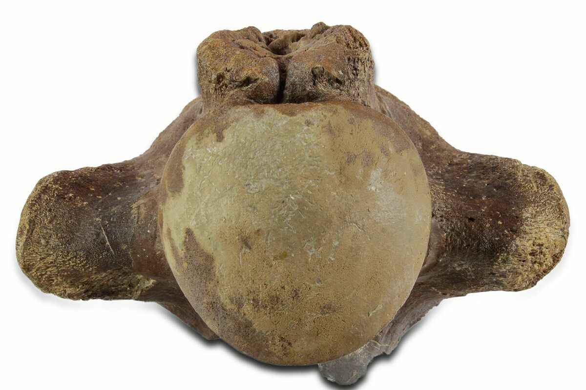This is a large, 7" wide mosasaur (Tylosaurus proriger) cervical vertebra collected from Fannin County, Texas. It comes out of the Cretaceous-aged Ozan Marl Formation in Texas. The preservation is wonderful, with the majority of the vertebra showing very little weathering. There are two repaired craks through the specimen, each of which required some minor gap fill restoration. The majority of this restoration can be seen along the concave face of the vertebra.