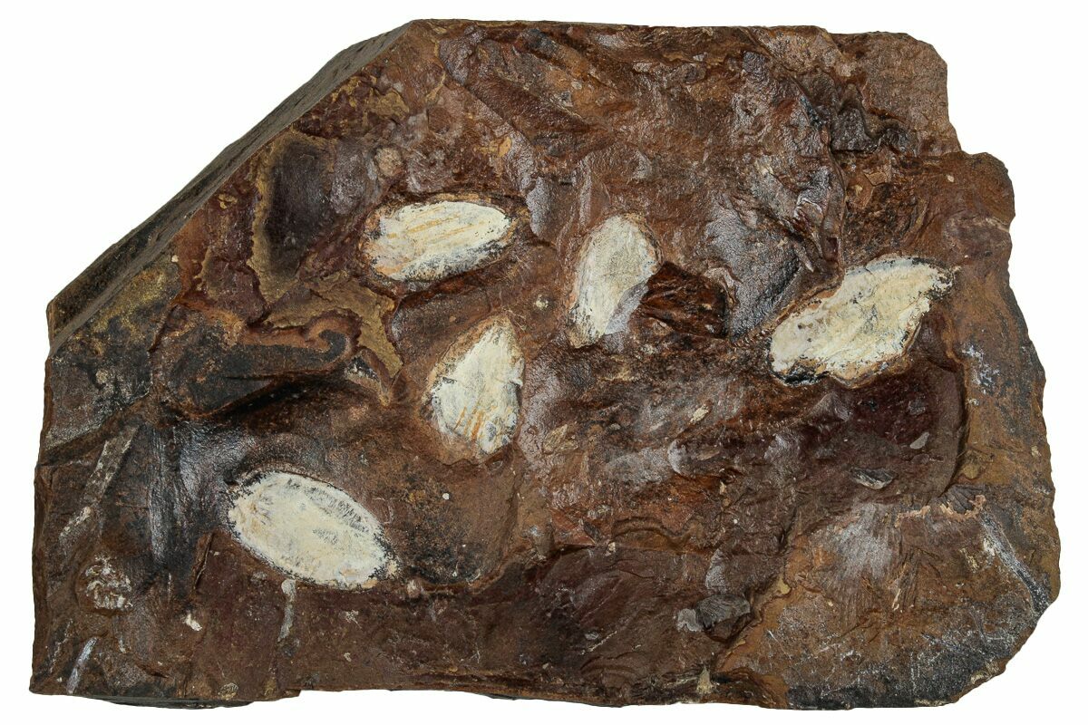 This is a plate of five wonderfully preserved fossil seed pods, collected from the Sentinel Butte Formation of North Dakota. They are finely detailed and the light preservation contrasts well against the dark orangish-brown rock. Faint leaf impressions can also be found on the other side.
