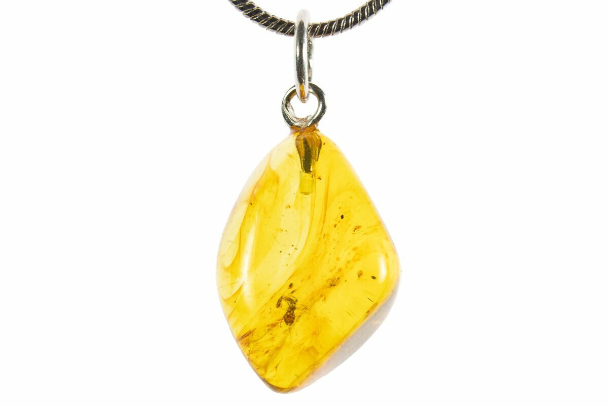 This is a .7" tall (including loop) pendant made from 44 million year old Baltic amber. Within the amber, a fossil ant (family Formicidae) can be seen. A loop has been attached to the amber, along with a secondary ring for the included 24" silver plated snake chain to complete the necklace.