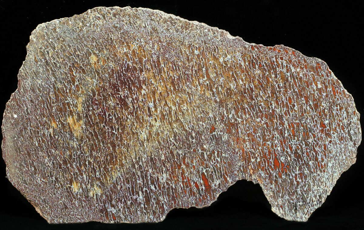 This is a beautiful section of polished Late Jurassic aged dinosaur bone from Colorado. One side has been polished a mirror finish which allows for the beautiful internal cell structure to be easily seen. I has some excellent deep red coloration with red highlights. The thickness ranges from quite thin on the outer edges to about .65" thick in the center. It comes with an acrylic display stand.