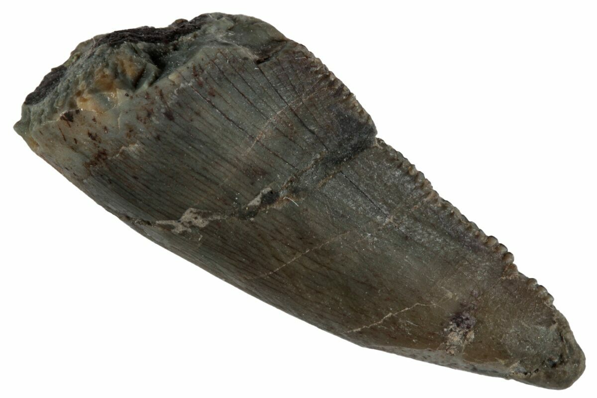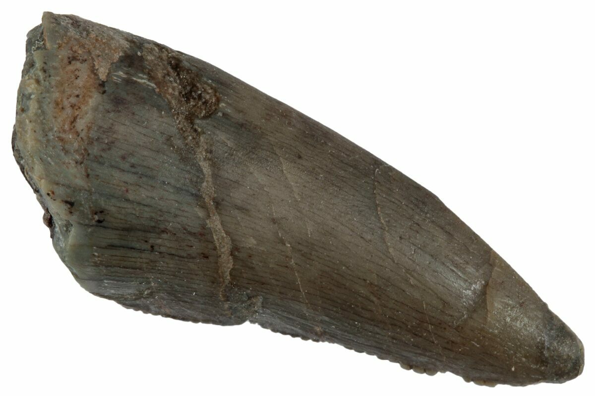 There are two main characteristics that distinguish it from the much more frequently found Allosaurus teeth. First, the serrations on the mesial edge of the tooth extend less than half way down the length of the tooth. Secondly, there is little to no spiraling of the serrations as seen on Allosaurus teeth. Additionally, it's also fairly thin in cross-section and has a hooked profile.