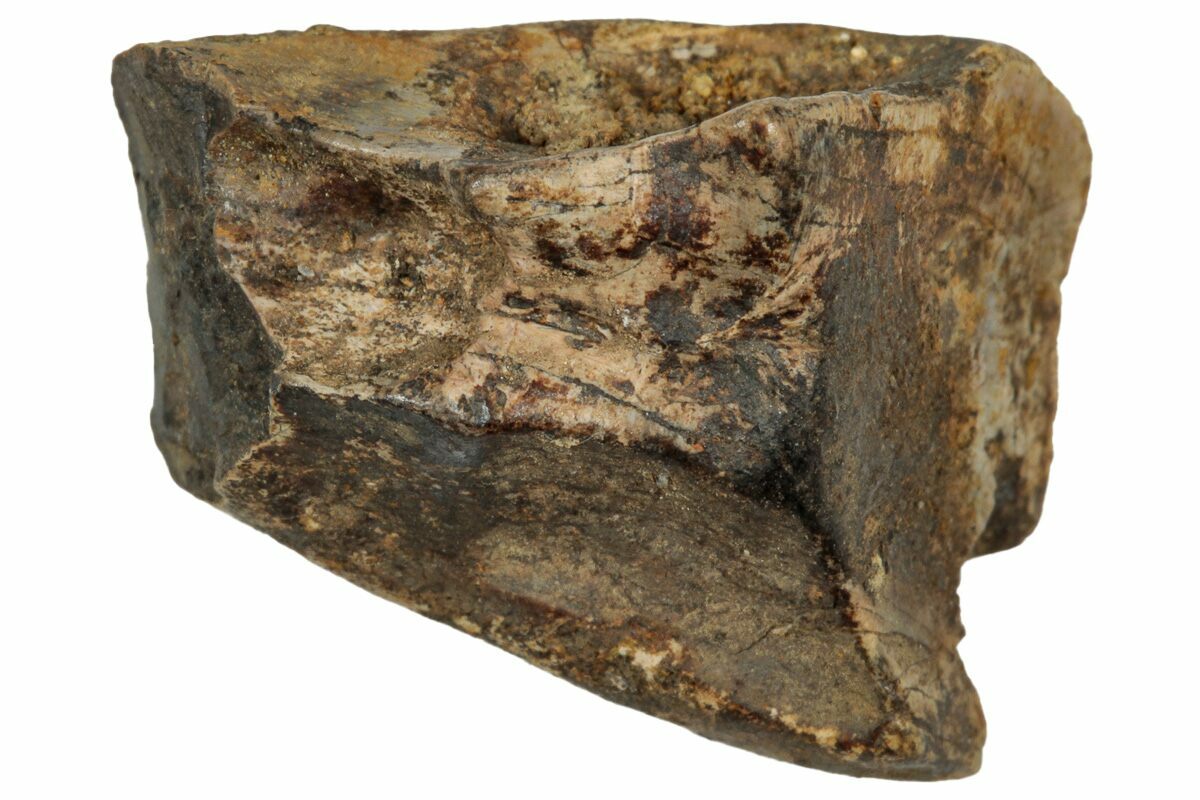 This specimen is one of those naturally shed teeth and features a polished chewing surface, showing clear evidence of the wear that came from processing vegetation millions of years ago.